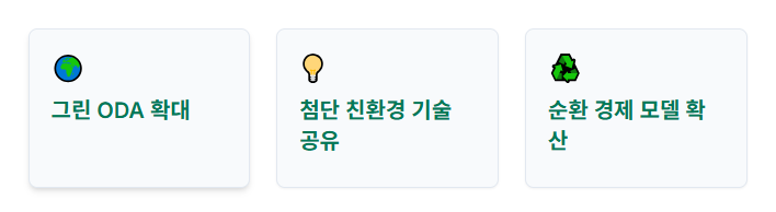 - 그린 ODA 확대: 개발도상국들의 기후 변화 대응 역량 강화를 위해 그린 분야 공적개발원조(ODA)를 확대하여 기술 및 재정적 지원을 제공할 것입니다.