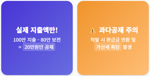 국세청은 보험사로부터 의료비 보전 내역을 수집합니다. 내가 100만 원을 냈어도 실손보험으로 80만 원을 돌려받았다면, 실제 내가 지출한 20만 원만 공제 대상입니다.