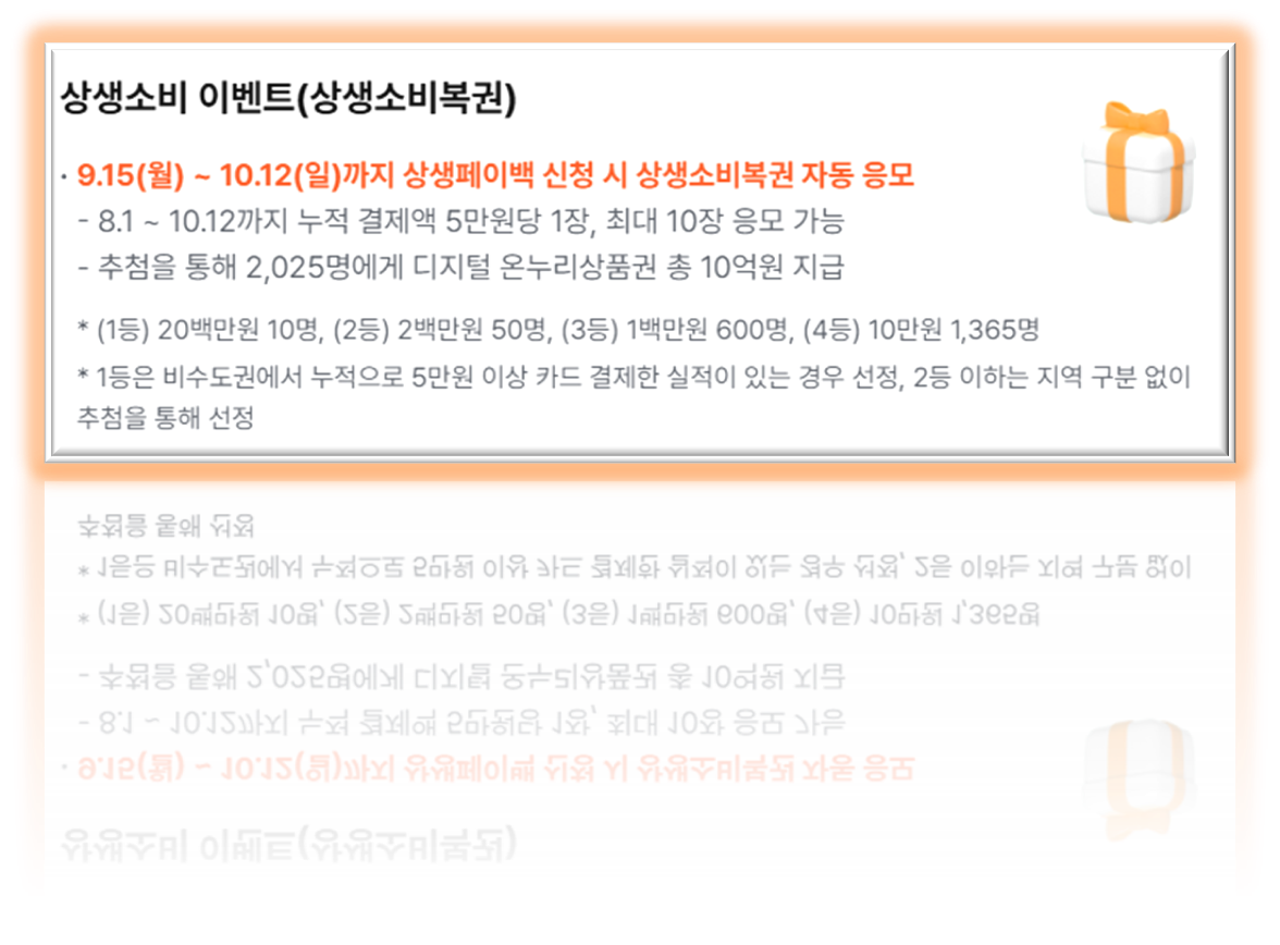 상생페이백의 또 다른 매력, 바로 ‘상생소비복권’ 이벤트입니다! 10월 12일까지 상생페이백을 신청하면 상생소비복권에 자동 응모됩니다. 복권은 8월 1일부터 10월 12일까지 상생페이백 인정 사용처에서 누적 카드 결제액 5만원당 1장씩, 최대 10장(50만원 이상 결제 시)까지 받을 수 있습니다.