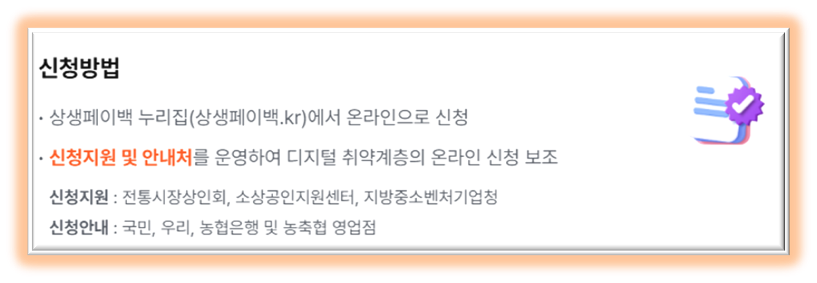 혹시 온라인 신청이 어렵더라도 걱정하지 마세요. 전통시장 상인회, 소상공인시장진흥공단 소상공인지원센터, 그리고 국민·우리·농협은행 및 농축협 영업점을 방문하면 신청 지원 및 안내를 받을 수 있습니다.
