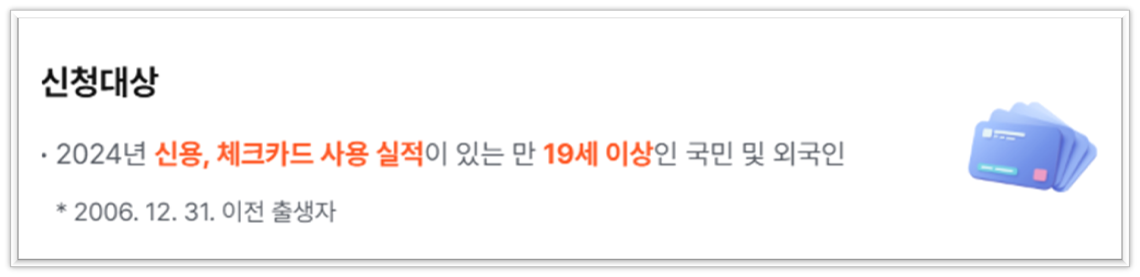 그렇다면 누가 상생페이백을 신청할 수 있을까요? 2024년에 본인 명의의 국내 신용 또는 체크카드 사용 실적이 있는 만 19세 이상 국민이라면 누구나 신청 대상입니다. 2006년 12월 31일 이전 출생자라면 모두 해당되니, 나이 요건을 잘 확인해 보세요.