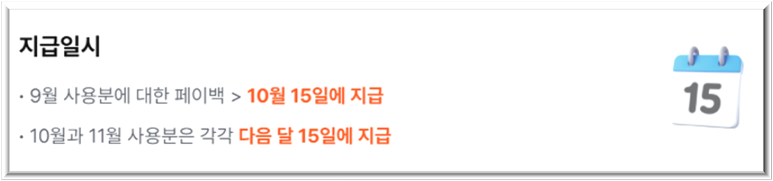 지급은 어떻게 될까요? 9월 사용분에 대한 페이백은 10월 15일부터 지급될 예정이며, 10월과 11월 사용분은 각각 다음 달 15일에 지급됩니다.
