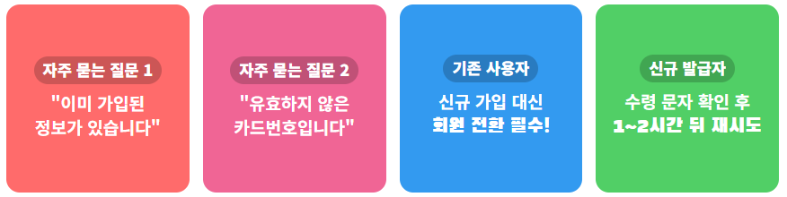 가장 많이 발생하는 문제는 "이미 가입된 정보가 있습니다" 또는 "유효하지 않은 카드번호입니다"라는 메시지입니다.