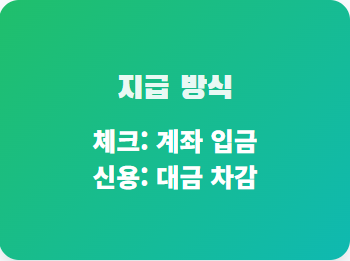 - 지급 방식: 체크카드는 연결 계좌 입금, 신용카드는 결제 대금 차감