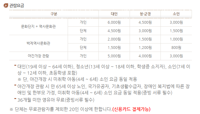 부여백제문화단지의 관람료는 성인 기준으로 약 5,000원이며, 청소년 및 어린이는 할인 혜택이 있습니다.