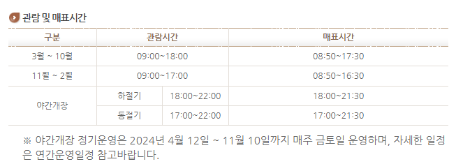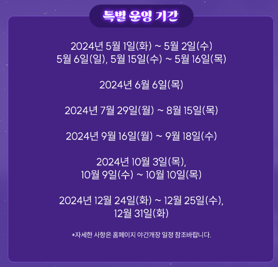 야간개장은 매주 금요일과 토요일에 진행되며, 개장 시간은 오후 6시부터 10시까지입니다. 여름철에는 야경을 즐기기에 최적의 시간대입니다.