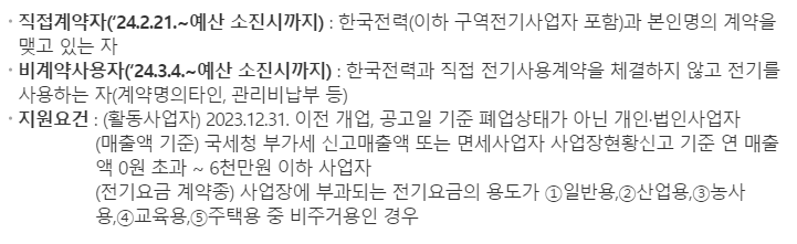 - 전기 사용 형태: 한국전력과 직접 계약을 체결하지 않고 전기를 사용하는 '비계약 사용자'에 해당해야 하며, 사업장용 전기요금을 부담하는 경우에만 지원이 가능합니다. 참고: 당해연도에 개업한 사업자는 월평균 매출액을 12개월로 환산하여 6천만 원 이하임을 증명해야 합니다.