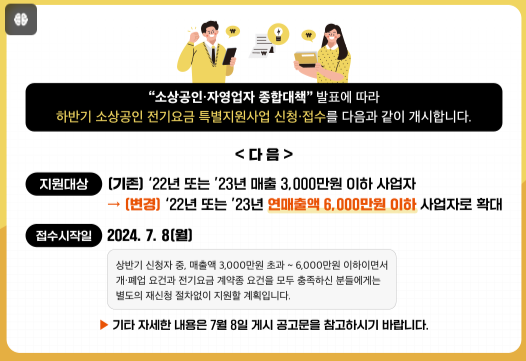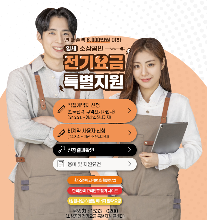 여름철 에어컨 가동으로 전기요금이 올라가셨지요? 이 지원사업은 최대 20만 원까지 전기요금을 지원받을 수 있는 기회로, 소상공인들에게 실질적인 도움이 될 것으로 기대됩니다. 예산소진 시까지 은 한시적 제도이니 빠른 신청 하세요.