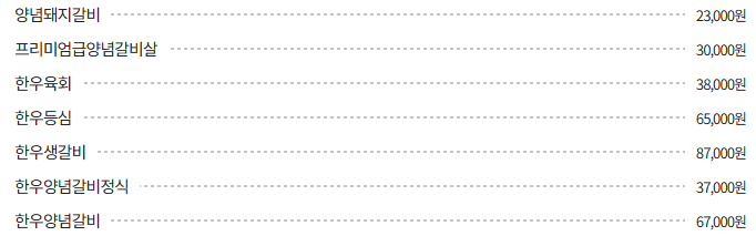 - 프리미엄급양념갈비: 57,000원 (고급스러운 수원 갈비)