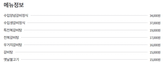 - 수입양념갈비정식: 34,000원 (점심 갈비정식으로 인기)