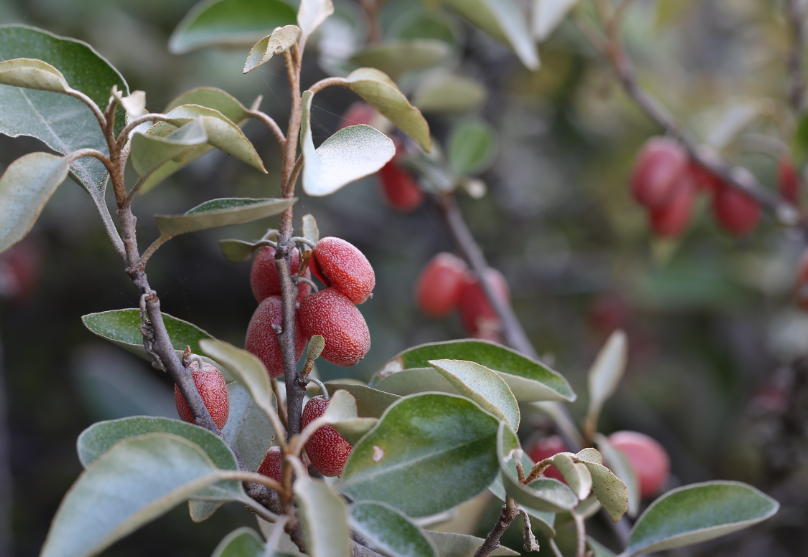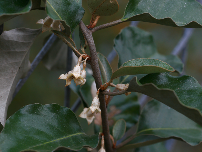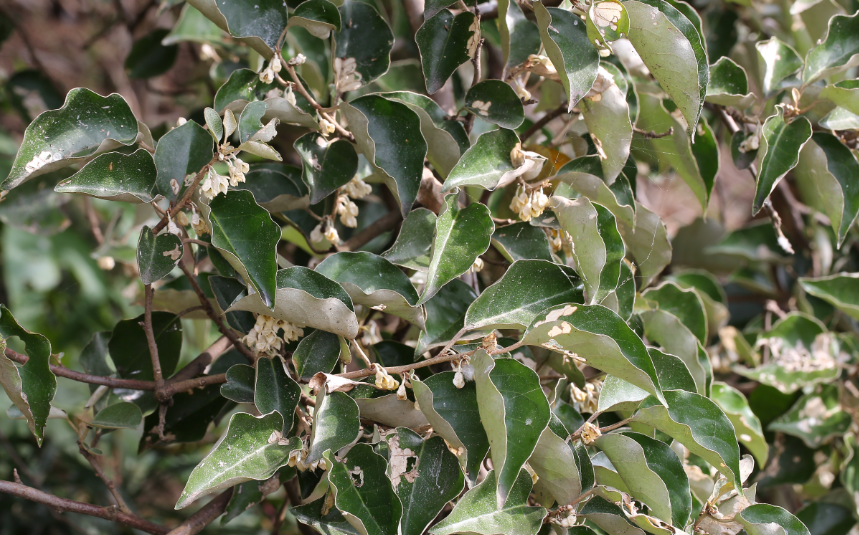 보리밥나무(Elaeagnus macrophylla Thunb.)는 바닷가 산지에 주로 자생하는 식물로, 길이 3~8m까지 자라나는 덩굴나무입니다. 특히 잎의 뒷면이 은백색 별 모양 털로 덮여 있어 신비로운 은빛을 띠는 것이 특징입니다.