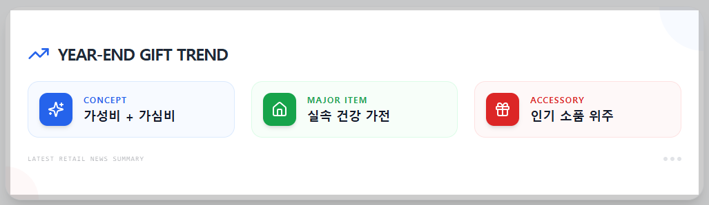 최근 일간지 보도에 따르면, 올해 연말 선물 시장은 '가성비'와 '가심비'를 동시에 잡는 실속형 건강 가전과 소품들이 주를 이루고 있다고 합니다.