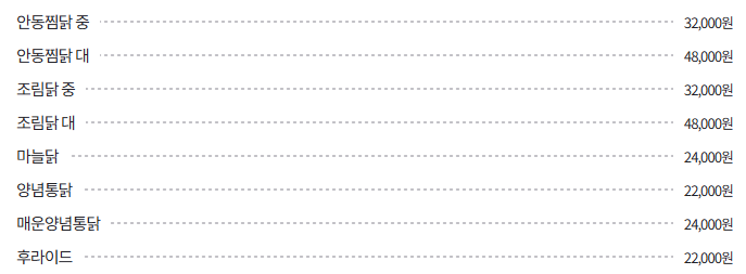 마늘닭 (24,000원): 마늘의 풍미가 더해진 특별한 닭 요리입니다.