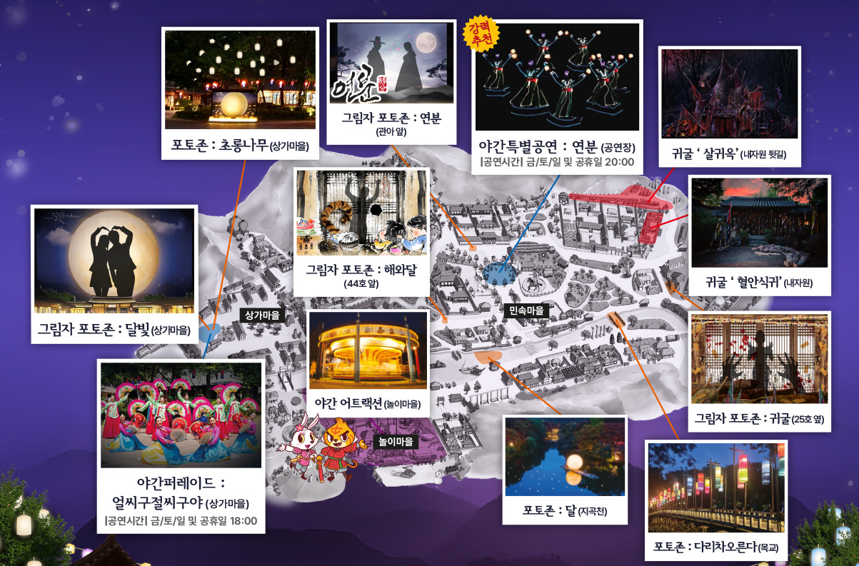 민속촌의 각 건물들은 조명으로 아름답게 꾸며져 있어, 야경을 감상하며 산책하기에 최적입니다. 특히, 연못가에서의 야경은 낭만적인 분위기를 자아냅니다.