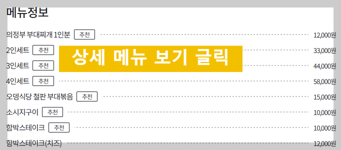보시는 것처럼 부대찌개는 인원별 세트 메뉴가 잘 구성되어 있어 편리하고, 부대볶음이나 소시지구이, 함박스테이크 같은 다른 메뉴들도 맛볼 수 있습니다.