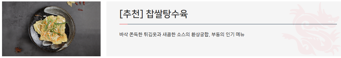 또한, 바삭 쫀득한 튀김옷과 새콤한 소스의 환상궁합, 부동의 인기 메뉴 찹쌀탕수육 많은 분들이 추천하는 메뉴입니다.