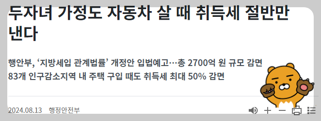 최근 행정안전부는 두 자녀 가정이 자동차를 구매할 때 취득세를 절반만 내도록 하는 내용의 ‘지방세입 관계법률’ 개정안을 입법 예고했습니다. 이와 함께 83개 인구 감소 지역에서 주택을 구매할 경우 최대 50%까지 취득세를 감면받을 수 있는 혜택이 마련되었습니다. 이러한 변화는 총 2700억 원 규모의 세금 감면 효과를 기대하게 합니다.