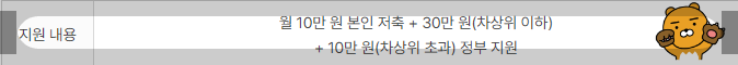- 저축 지원: 청년이 매달 저축하는 금액에 대해 정부가 추가로 지원합니다. 예를 들어, 매달 10만 원을 저축하면 정부에서 10만 원을 추가로 지원하여 총 20만 원이 됩니다.