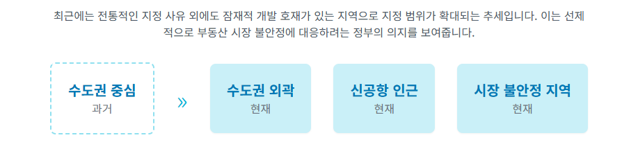 최근에는 수도권 외곽, 신공항 인근 지역 등 잠재적 개발 호재가 있는 곳이나 이미 주택 시장이 불안정한 지역에 지정되는 사례가 많습니다.
