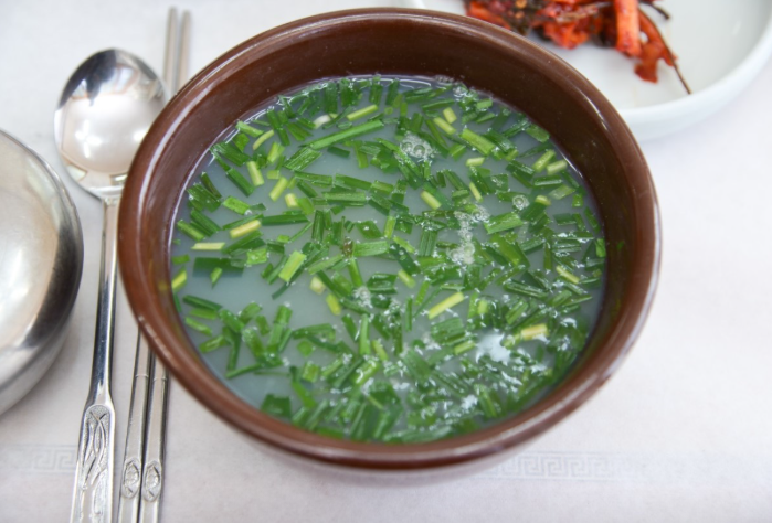 재첩정식(12,000원)은 푸짐한 부추와 정갈한 10가지 기본찬으로 든든한 한 끼를 제공합니다. 국내산 하동 재첩만을 사용하니 더욱 믿고 드실 수 있습니다.