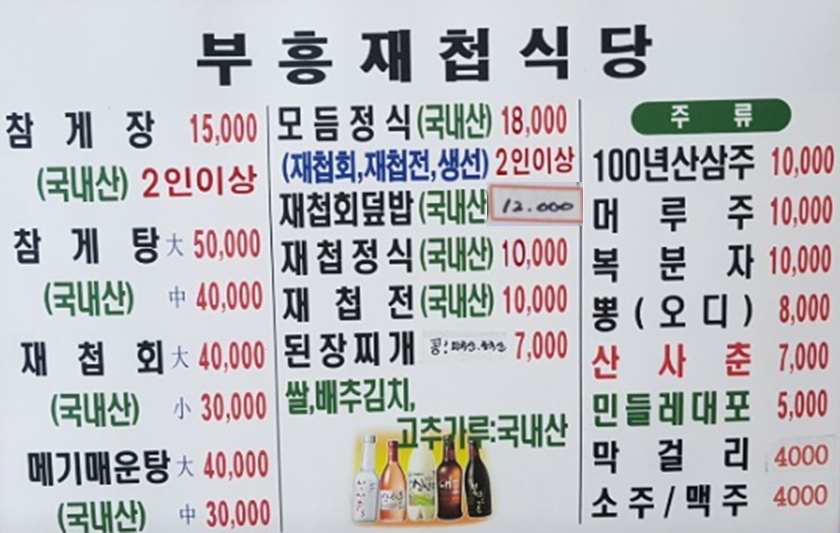 또한 재첩전과 생선구이 등이 함께 나오는 모둠 정식(18,000원)은 여러 재첩 요리를 한 번에 맛볼 수 있어 인기가 많습니다.