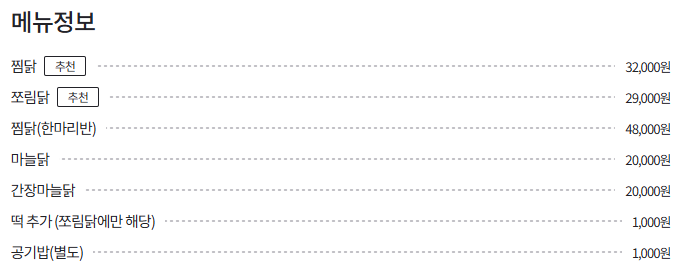 - 쪼림닭: 국물 없이 바짝 조려내고 떡 사리가 들어가며, 2~3인분 양으로 적당해요.
