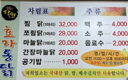 효자통닭의 메뉴는 크게 찜닭, 쪼림닭, 마늘닭, 간장마늘닭 네 가지 닭 요리가 있어요. 모든 식재료는 국내산을 사용한다고 합니다.