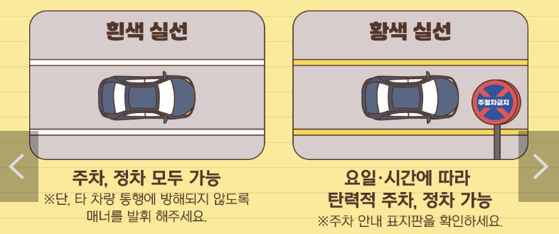 - 흰색 실선: 주차와 정차 모두 가능하지만, 다른 차량의 통행에 방해되지 않도록 주의해야 합니다.