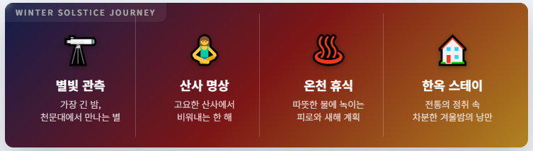 밤이 가장 긴 동지를 맞아, 특별한 겨울 여행을 계획해 보는 것은 어떨까요? 해가 짧아지는 만큼 밤의 아름다움을 만끽할 수 있는 여행지를 찾아보는 것도 좋은 경험이 될 것입니다. 별을 관측할 수 있는 천문대나 고요한 산사에서 명상하며 한 해를 돌아보는 시간을 가져보는 것은 어떨까요?