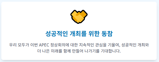 우리 모두가 이번 APEC 정상회의에 대한 지속적인 관심을 기울여, 성공적인 개최와 더 나은 미래를 함께 만들어 나가기를 기대합니다.