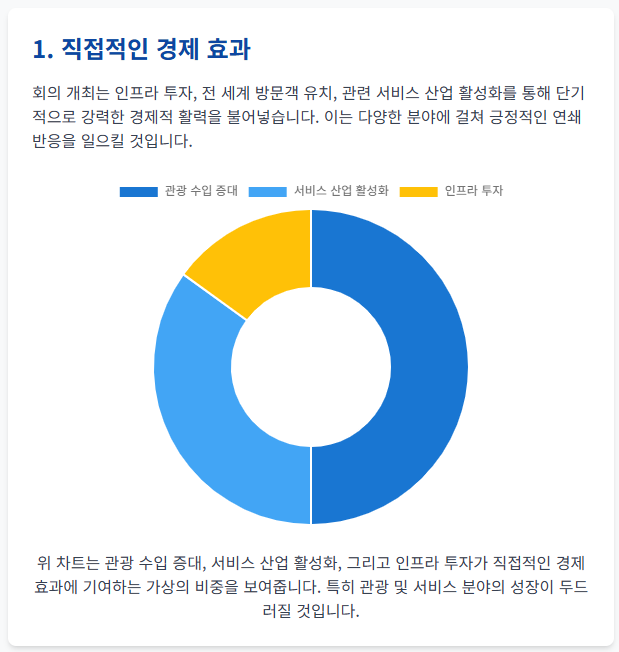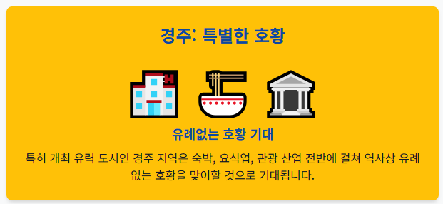 - 직접적인 경제 효과: 회의 개최를 위한 인프라 투자, 전 세계에서 방문할 방문객 유치로 인한 관광 수입 증대, 행사 관련 서비스 산업 활성화 등 단기적인 경제적 활력을 불어넣을 것입니다. 특히 경주 지역의 숙박, 요식업, 관광 산업은 역사상 유례없는 호황을 맞이할 것으로 기대됩니다.
