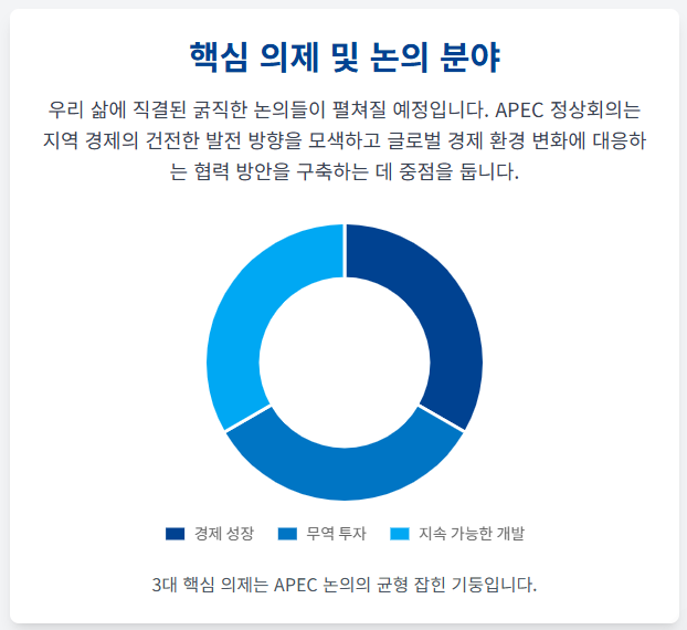 2025년 APEC 정상회의에서는 단순한 경제적 협력을 넘어, 아태 지역의 미래를 좌우할 다음 의제들이 심도 깊게 논의될 것으로 전망됩니다. 주목해야 할 세 가지 핵심 의제를 짚어보겠습니다.