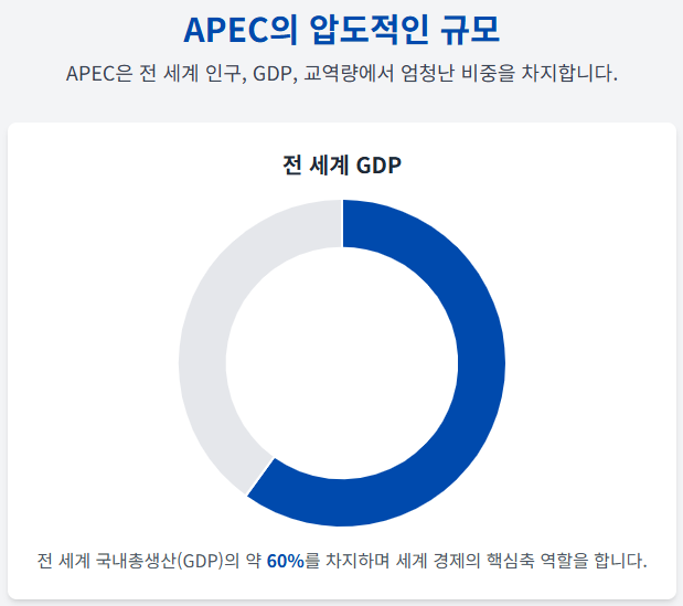 전 세계 인구의 약 3분의 1, 전 세계 국내총생산(GDP)의 약 60%, 전 세계 교역량의 약 50%를 차지하는 이 거대한 경제권이 바로 APEC입니다. 이 정도면 APEC이 세계 경제에 미치는 영향력이 얼마나 엄청난지 짐작이 가시나요?
