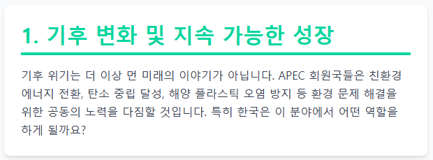 - 기후 변화 및 지속 가능한 성장: 기후 위기는 더 이상 먼 미래의 이야기가 아닙니다. APEC 회원국들은 친환경 에너지 전환, 탄소 중립 달성, 해양 플라스틱 오염 방지 등 환경 문제 해결을 위한 공동의 노력을 다짐할 것입니다. 특히 한국은 이 분야에서 어떤 역할을 하게 될까요? [ APEC 기후 변화 대응 의제: 한국의 역할과 지속 가능한 미래 전략 ]에서 이 중요한 의제에 대한 한국의 입장과 노력을 더 깊이 다룰 예정입니다.
