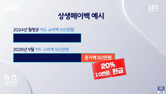 예를 들어, 2024년 월평균 카드 사용액이 100만원이었는데, 2025년 9월에 150만원을 사용했다면? 증가분 50만원의 20%인 10만원을 환급받게 되는 거죠!