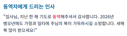 성도 간 인사: "집사님, 지난 한 해 동안 기도로 동역해주셔서 정말 감사했습니다. 2026년 병오년에도 주님의 예비하신 복이 가정과 일터에 가득하시길 소망합니다. 새해 복 많이 받으세요!"