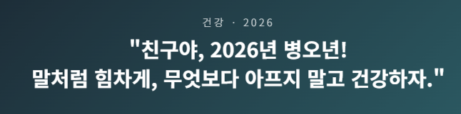 추천 문구 01: "친구야, 2026년 병오년에도 우리 '말'처럼 힘차게 달려보자고! 무엇보다 아프지 말고 건강하게, 얼굴 자주 보며 맛있는 거 먹는 한 해 되자. 새해 복 많이 받아라!"