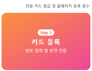 혜택을 받기 위해서는 먼저 전용 카드를 발급받고 누리집(홈페이지) 등록을 완료해야 합니다.