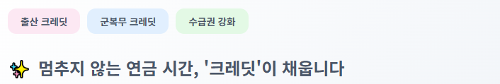 이러한 크레딧 제도는 가입 기간을 늘려 연금 수급권을 확보하고 수령액을 높이는 데 기여하므로, 해당되는 분들은 반드시 확인해야 할 중요 변화입니다.