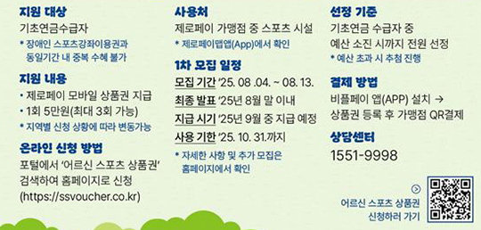 '어르신 스포츠 상품권'은 **기초연금을 받는 만 65세 이상 어르신이라면 누구나 신청할 수 있습니다.** 상품권 1장당 5만 원의 가치를 지니며, 지자체별 신청 상황에 따라 **1인당 최대 15만 원까지 지원**받을 수 있다는 점이 큰 매력입니다.