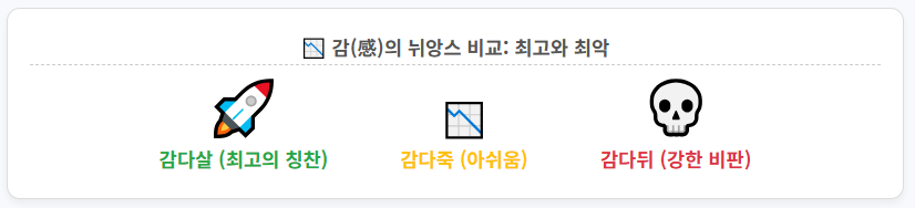 이처럼 세 단어는 '감'이라는 키워드를 중심으로 **칭찬, 아쉬움, 강한 비판**이라는 극과 극의 감정을 표현하며, 대화의 재미를 더합니다.