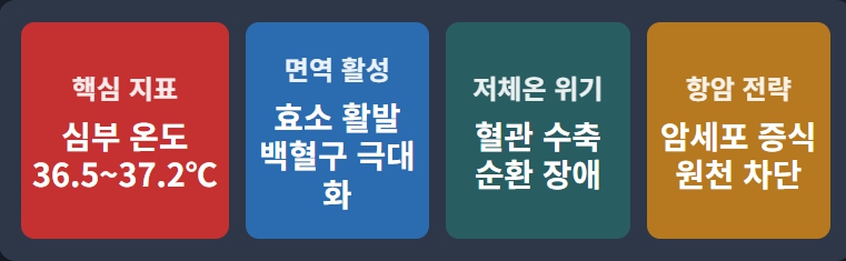 피부 표면 온도가 아닌 장기 내부의 온도인 '심부 온도(Core Temperature)'가 중요합니다. 심부 온도가 적정 수준(36.5~37.2℃)을 유지할 때 효소 활동이 가장 활발해지고 백혈구의 탐식 작용이 극대화됩니다.