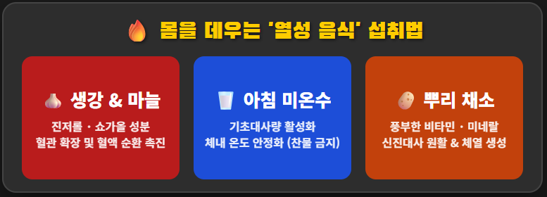 * 생강과 마늘: 생강의 진저롤과 쇼가올 성분은 혈관을 확장해 혈액 순환을 촉진하고 체온을 높이는 대표적 열성 식품입니다.
