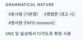 문법적으로는 주로 동사형으로 쓰이며, 상대방에게 경고를 보낼 때는 명령문 형태로 사용되기도 합니다. 최근에는 SNS에서 해시태그(#)와 함께 명사처럼 쓰여 "이건 완전 FAFO 순간(FAFO moment)이야" 같은 방식으로도 확장되고 있습니다. 다만, 비속어가 포함되어 있으므로 격식 있는 자리에서는 반드시 사용을 지양해야 하는 Slang임을 인지해야 합니다.