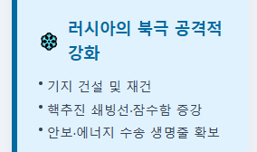 - **러시아의 북극 전략:** 러시아는 북극해를 자국의 중요한 국방선이자, 에너지 및 자원 수송을 위한 생명줄로 여깁니다. 서방 국가들과의 긴장 상황에서 북극은 러시아의 전략적 우위를 점할 수 있는 잠재적 공간이 됩니다.