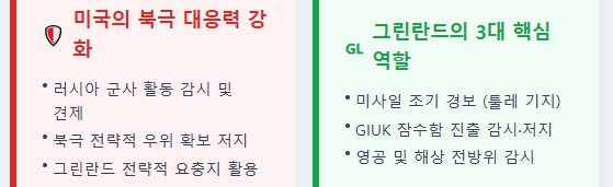 - **미국의 대응 전략 속 그린란드:** 미국은 러시아의 이러한 움직임에 맞서 북극 지역에서의 군사적 대응력을 강화하고 있습니다. 그린란드는 러시아의 군사 활동을 감시하고 견제하는 데 있어 매우 중요한 위치에 있습니다.