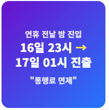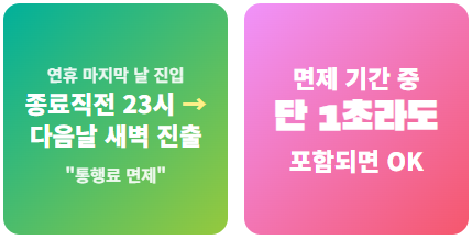 반대로 면제 마지막 날 밤에 진입하여 연휴가 지난 뒤 나가더라도 혜택을 받을 수 있으니 안심하고 운전하세요.