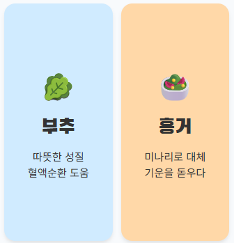 - 🌱 부추: 따뜻한 성질로 몸의 찬 기운을 몰아내고 정력 보강에 좋습니다.