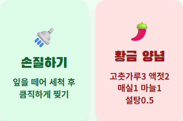 🥣 양념장 배합: 고춧가루 3큰술, 멸치액젓 2큰술, 매실액 1큰술, 다진 마늘 1큰술, 설탕 0.5큰술, 참기름/통깨 약간