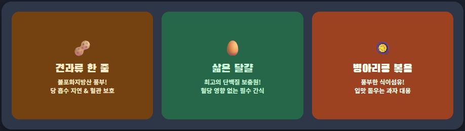 ✅ 견과류(한 줌): 호두, 아몬드는 불포화지방산이 풍부해 당 흡수 속도를 늦추고 혈관을 보호합니다.